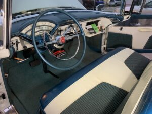 It was restored in 1990 at 14,000 miles. The body was sprayed in Alaska White with Glen Lake Blue metallic. The engine and transmission were pulled, the trans was rebuilt while the engine heads were removed and also rebuilt to include hardened valve seats for use with today’s unleaded fuels. Other options; amber road lamps, swivel tissue dispenser and fender skirts. Also New radials and carpets